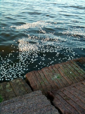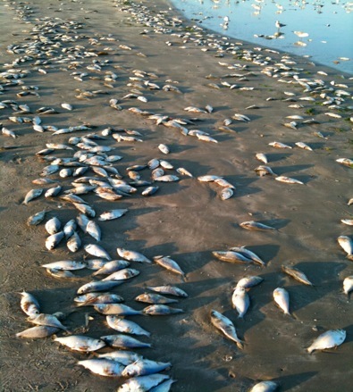 Harmful Algal Blooms (HABs) are pretty much just like they sound. They are blooms of toxic marine algal species that occur mainly in coastal waters under certain environmental conditions. HABs come in many different forms depending on the species of algae involved. In the Gulf of Mexico the most common species Karenia brevis is a yellow-green, marine dinoflagelate that produces a variety of neurotoxins, collectively called brevitoxins, and causes massive fish kills. When a large bloom of K. brevis occurs it often results in a reddish brown discoloration of the water and is referred to as “Red Tide”. Because the dinoglagelates are unarmored the cells easily break apart in the surf and the neurotoxins become aerosolized causing a variety of health problems for people and pets walking on the beach. Symptoms range from a tingling of the tongue and lips to coughing and other respiratory problems. During the latest HAB event (Fall 2009) in south Texas the Parks and Wildlife department reported coyote deaths along the Padre Island National Seashore that were attributed to ingestion or inhalation of brevitoxins.